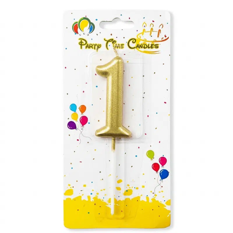 1 Golden Number Candle features a sleek golden finish, perfect for first birthdays and milestone celebrations, available at only 1 OMR.