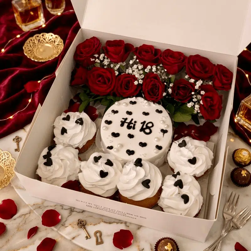 Bento White Box Combo features a minimalist white cake paired with matching cupcakes and fresh flowers, creating a perfect elegant gift for celebrations and special occasions.