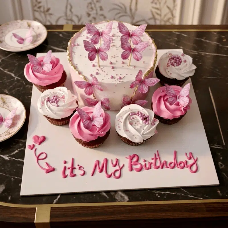 Pink Butterfly Cake Cupcakes Combo includes a fixed size cake and 6 cupcakes with elegant butterfly and pearl decorations, perfect for girly birthdays at just 7.9.