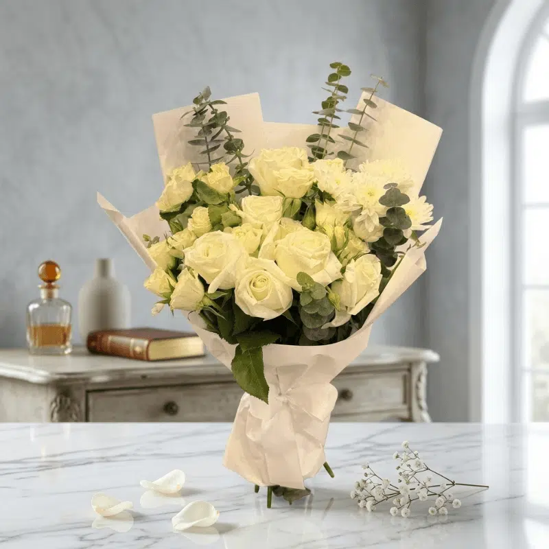 Pure Delight Floral Bouquet is a beautiful arrangement of fresh flowers designed to bring elegance and charm, making it a perfect gift for celebrations and special moments.