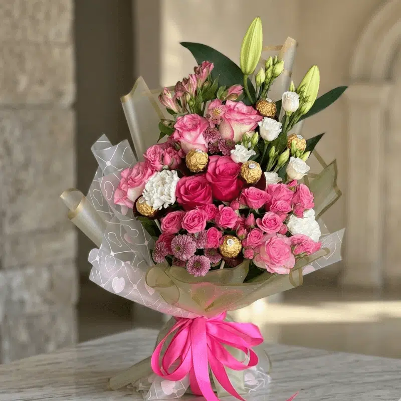 Radiant Ferrero Bouquet is a luxurious combination of premium chocolates and fresh floral arrangement, creating a unique and indulgent gift for celebrations and special moments.