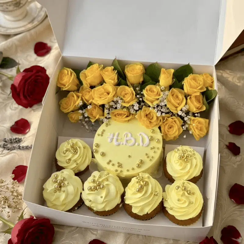 Yellow Celebration Box Combo includes a vibrant cake with cupcakes and fresh flowers, offering a cheerful and complete gift for joyful celebrations.